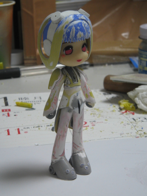 ほかのピンキーと並べた時に体格を統一させようとあえてスレンダーなスタイルで作ったのですが、腰まわりがちょっとムッチリしている方がヴィヴィアンっぽいと再判断し太もも若干太くし、バランス調整の為、腕のライン修正。また意外と胴体がねじれて製作されていた事に気付いちゃったので胸部と腰部を切り離し修正後接着、再度ライン調整を行っております。