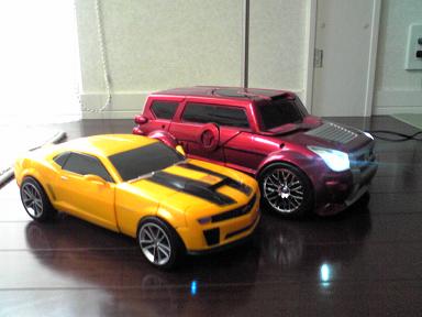 車にトランスフォームさせてみました。奥の赤いのは、相変わらずのV-BOTです。ちなみに過去ブログにも書きましたがV-BOTは「コントローラーのスイッチひとつで自動変形」してこの車状態になります。