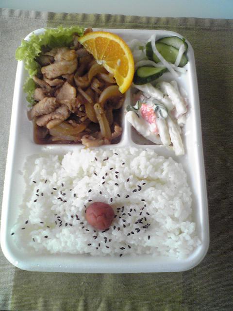 で、数あるメニューの中でたぶんコレだろ?と思ったのが写真の「焼肉弁当」。すごいのがパッケージがほぼ思い出どおりだった事。白地にオレンジの紙パッケージが輪ゴムで止められていて、白い発泡スチロール容器にふた。そのふたをあければごはんの真ん中にうめぼし。昔はもっとカリカリした真っ赤なうめぼし(うめしばっていうの?)だった気がするんだ。ハッキリ言って味なんて覚えてないよ。知ってるケド、味は覚えていない「ケンちゃんラーメン」みたいなものだよねー(笑)