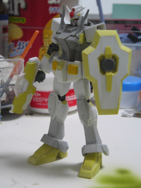 整形後、プラ板やらプラ棒やらで細かい部分を作り(白いトコ)、銃口に市販バーニアパーツ埋め込んで(灰色のトコ)みました。