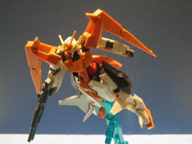 HGアリオスは独特の肩関節を持っています。通常は胸部横から挿す接続ですが、これは上から挿す方式。なので一見殺風景にみえる飛行ポーズも肩を大きく反らせ胸を張っているような力強い演出が可能。