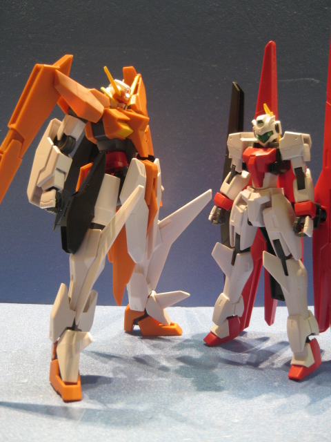 世間では「夫婦ガンダム」と言われているGNアーチャーと並べてみました。こうやって並べてみると「男と女」を描き分けていると言い切ってもおかしくないですよね。