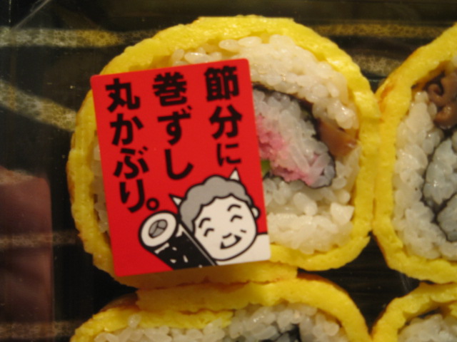 もちろん夕飯は太巻きです。スーパーの出来合いですが、パッケージにこんなシールが貼ってありました。