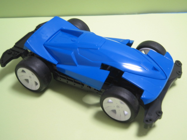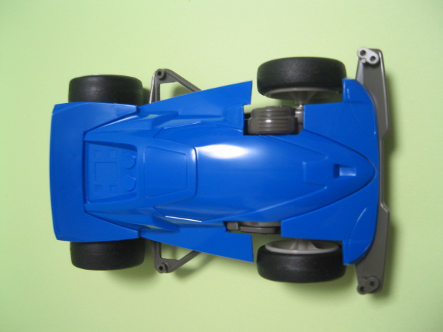 ボディの左前輪付近に切りかきがあり、灰色のシャーシが一部見えてますね。ここにギアが入ってます。フロントにモーターが入ってる証拠っすね。しかしながらこのボディ、いかにも安定してますよ。ってカンジじゃないですか?(俺だけか?)