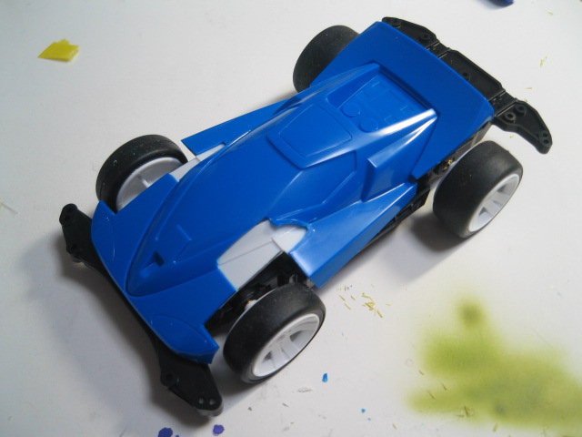 さて、ずっと話題にしているミニ四駆のソリチューなんですが、悩んだあげくボディをMSシャーシに乗せる事にし今日は穴ふさぎの第1段階を行いました。
