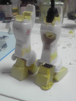 先ほどあけた脚部の穴にパテをつめ、離型剤を塗ったダミーでスタンプします。(ちなみにこの様に形状を使って形状を反転する手法を職場では"おっぺし"と言います)