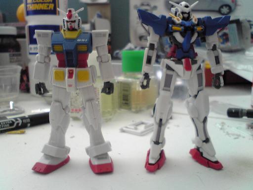 なんと主要部分は塗装済なんですね、このキット。たった10分程度の組み立てでこの仕上がりです。隣にいるのがガンダムエクシア。この世界観に合わせて製作開始です。