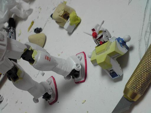 RX-78とオーガンダム。キャラを切り取ったアウトラインは非常に似ているんです。まぁ、監督が「RX-78を第1話に出す」と言っただけあってソックリなんですが、そこにワナがありまんまとそれに引っかかったワケです。なにがワナなのかというと、RX-78の関節にはマルイチモールドがあってそこが軸になっているんですが、オーガンダムにはそれが存在しないんです。雑誌の作例を見ても別キットから手足を流用して作ってらっしゃる。ようやく理解できました(笑)じゃぁ削ってパテで整形しよう!としても削ったら強度が落ちるどころか穴があくありさまで。