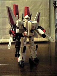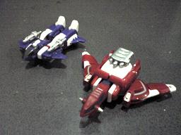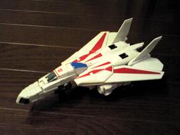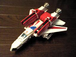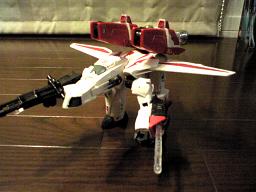 なんと彼のボディを形成する金型はマク■スの女好き酒好きな方の愛機▼F-1バ●キリー(スーパーパック装備)まんまだったのです!(カラーリングは黒黄ラインは廃され、赤ラインに変更になってます。そのカラーリングだってアレなんですが)