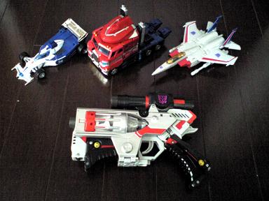 特にお気に入りは写真下の「メガトロン」。つーか、米国でよく銃型のTOYで販売できたな、とまずは関心。変形パターンはいわゆる「ガワ変形」なんですが、四肢があっちゃこっちゃ複雑に移動して最後に銃を模したフレームで包み込むといったいい意味で「パズル」のようなおもしろさがあります。しかもこの銃・・・