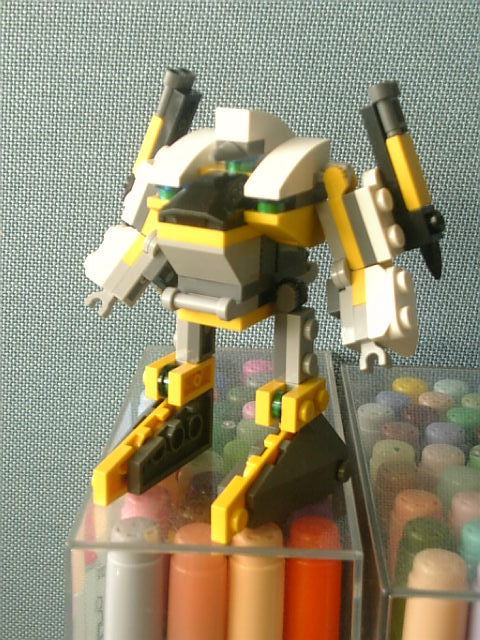以前作ったやっつけデザインなロボではなくて、今回は色の配置やクリアパーツの意味などいろいろ踏まえて製作。ホントは赤を主体に組みたかったんですが、赤いブロックがなかなか入手できないんですよ。高額な大きなアイテムには赤が多いんですが、小さなブロックばかりが集まった小型商品買おうとすると工事車両ばっかに…。で、黄色ばかりが増えていくワケです。まぁ、黄色も好きな色なんで別に気にしてないんですが。