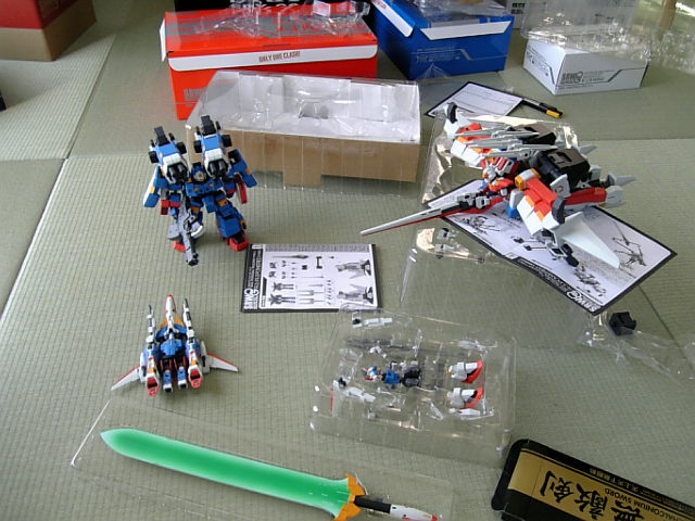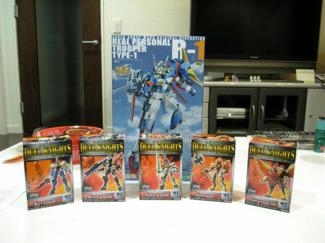 手前の小箱はプラモ買った帰路で立ち寄ったコンビニに売ってた食玩「鋼鉄の戦騎デュエルナイツ~炎の惑星編~」のフルコンプ。